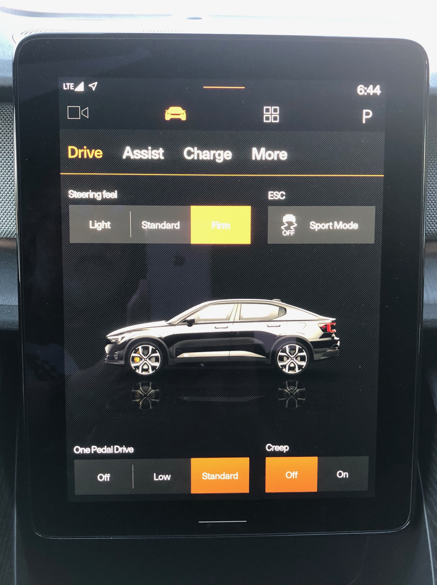 The Polestar 2 features one pedal driving—a favorite of mine and many other EV drivers—where thanks to regenerative braking, you use only the accelerator to move forward or slow down (even to a full stop). Of course, the brake pedal is right there when you need it, but in normal driving you can ignore it. The car offers three drive modes for regenerative braking (Off, Low, Standard), along with on or off settings for creep mode (acts like a “normal” automatic). It could stop and go with pinpoint accuracy with the “Standard” setting.