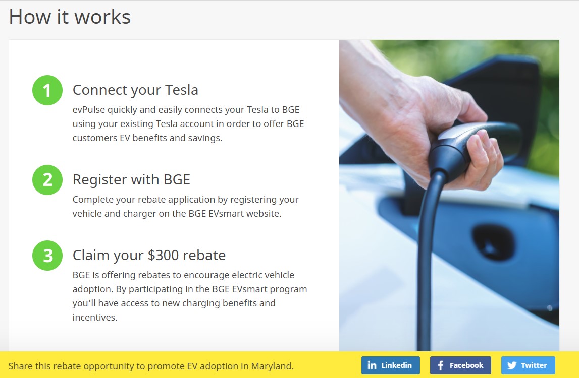 It’s unlikely that customers will know they are using WeaveGrid software, as it’s “white labeled” for use by utility companies. WeaveGrid’s first flagship customer is Baltimore Gas and Electric (BGE), as seen in the images above and below. They are offering evPulse, a rebate and time-of-use program for Tesla owners that uses WeaveGrid. Here’s what the online sign-up process looks like.